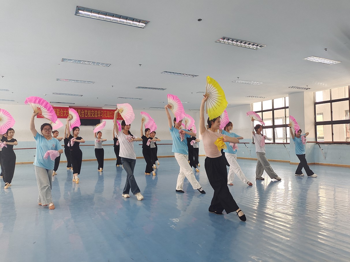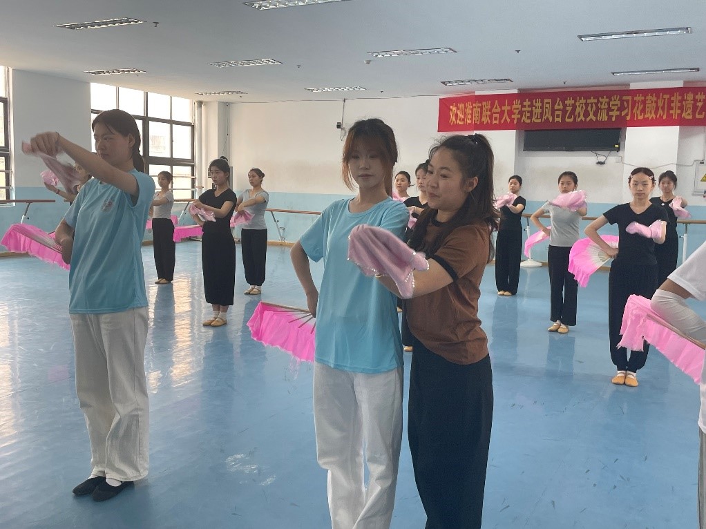 我院“淮河花鼓”实践团首先走访了凤台县花鼓灯艺校,与花鼓灯艺校的校长和老师们进行了深入交流,录制口述史,挖掘花鼓灯的历史脉络与传承故事。同时,师生们亲身学习花鼓灯舞蹈动作。从 “大花场” 的热烈欢快,到 “小花场” 的细腻传情,大家认真揣摩每一个步伐、每一次手势,在一招一式中感受花鼓灯刚柔并济的艺术魅力。